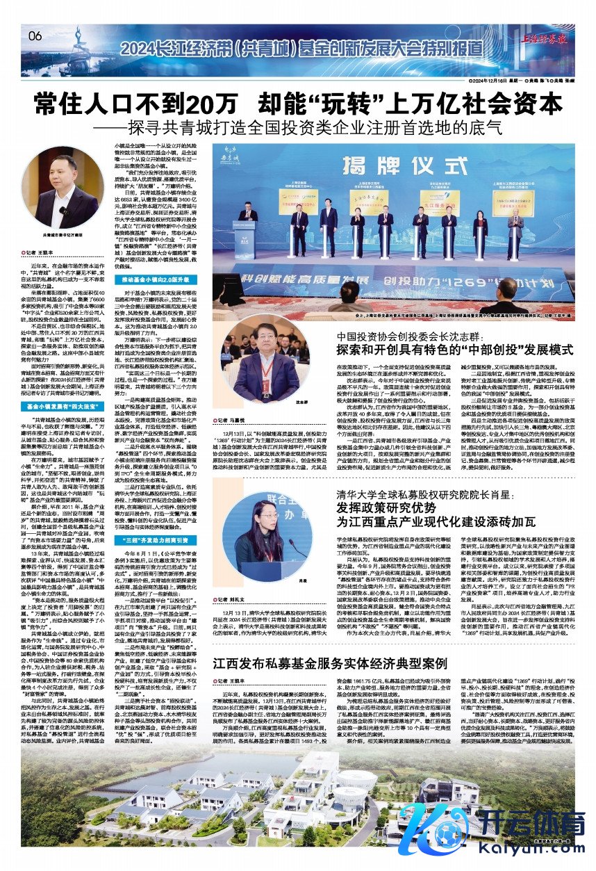 咫尺,共青城基金小镇存续企业达6652家,认缴资金界限超3400亿元,影响社会成本超万亿元。共青城与上海证券来去所、深圳证券来去所、清华大学各人私募股权询查院等开展配合,成立“江西省专精特新中小企业投融资路演基地”等平台,常态化经办“江西省专精特新中小企业‘一月一链’投融资路演”“长江经济带(共青城)基金改进发展大会专题路演”等产融对接活动,赋能小镇良性发展,作念优作念强。