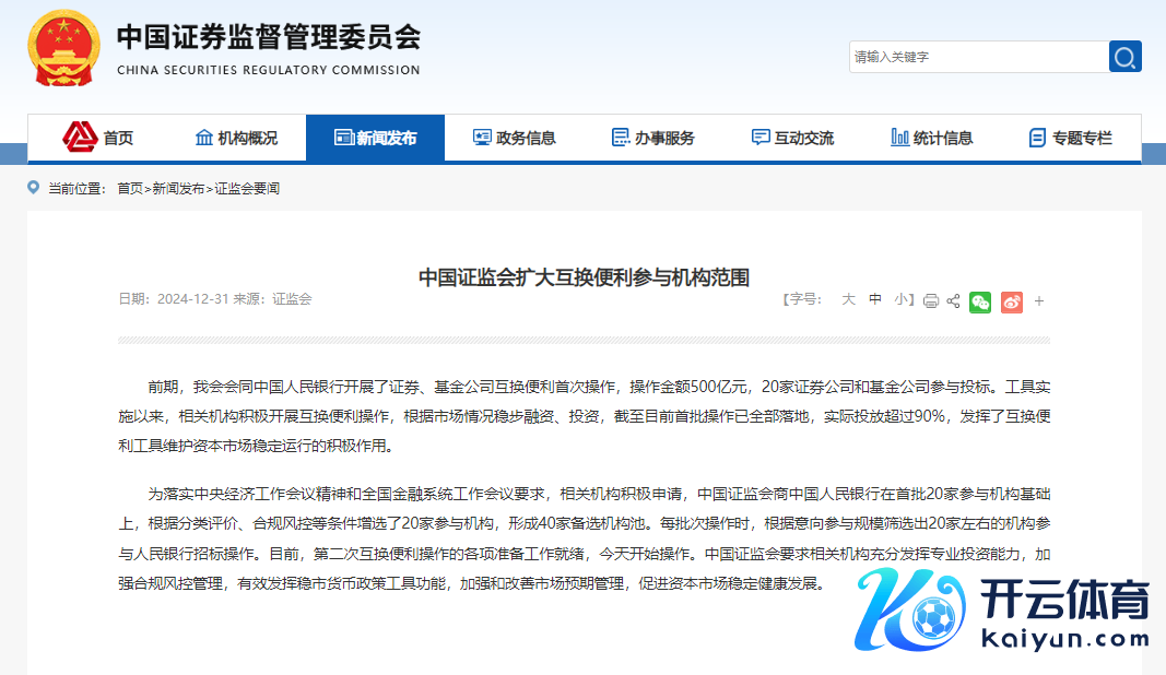 证监会提到为落实中央经济责任会议精神和寰球金融系统责任会议要求,干系机构积极请求,中国证监会商中国东说念主民银行在首批20家参与机构基础上,字据分类评价、合规风控等条目增选了20家参与机构,酿成40家备选机构池。每批次操作时,字据意向参与规模筛选出20家附近的机构参与东说念主民银行招标操作。现在,第二次互换便利操作的各项准备责任就绪,今天启动操作。中国证监会要求干系机构充分阐扬专科投资才调,加强合规风控解决,有用阐扬稳市货币战术器具功能,加强和改善市集预期解决,促进老本市集踏实健康发展。
